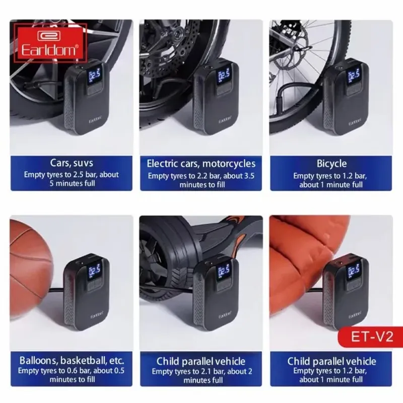 - یک دستگاه برای همه چیز! به لطف سریهای (نازلهای) متنوعی که همراه دستگاه ارائه میشود، ET-V2 یک آچار فرانسه واقعی است. از لاستیک خودرو، SUV و موتور سیکلت گرفته تا دوچرخه، توپ فوتبال، بسکتبال و حتی وسایل بادی تفریحی، هیچ چیز از پس این دستگاه برنمیآید.