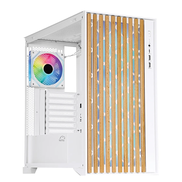- ✔️ طراحی الهامبخش برای ستاپهای سفید: پنل جلویی با طرح چوب روشن در کنار بدنه سفید مات، تضادی زیبا و مدرن ایجاد کرده که این کیس را به نقطه کانونی هر اتاق گیمینگی تبدیل میکند.