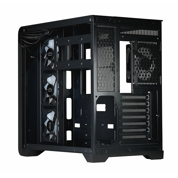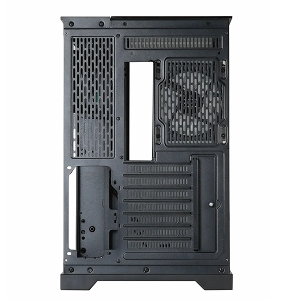 - ✔️ ساختار دوال چمبر (Dual Chamber): طراحی دو محفظهای، منبع تغذیه و تجهیزات ذخیرهسازی را در پشت سینی مادربرد پنهان میکند. این ویژگی نه تنها به زیبایی سیستم کمک میکند، بلکه باعث بهبود جریان هوا در محفظه اصلی میشود.