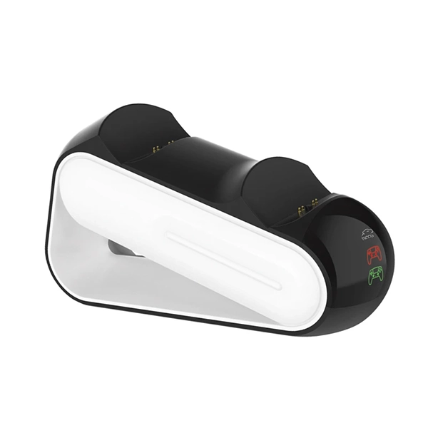 - ✔️ طراحی مدرن و اتصال آسان: شارژ از طریق پینهای مخصوص (Pogo Pin) در زیر دسته انجام میشود که اتصال را بسیار ساده کرده و از استهلاک پورت USB-C کنترلر جلوگیری میکند. پدهای ضد لغزش در زیر پایه نیز ثبات کامل آن را روی هر سطحی تضمین میکنند.