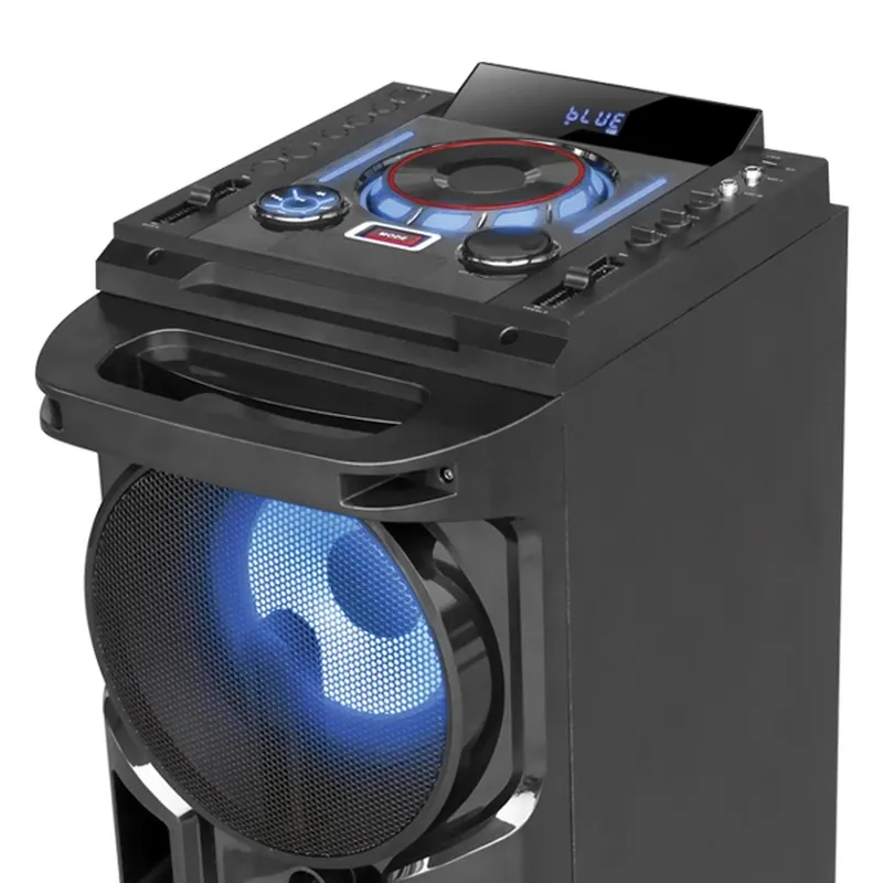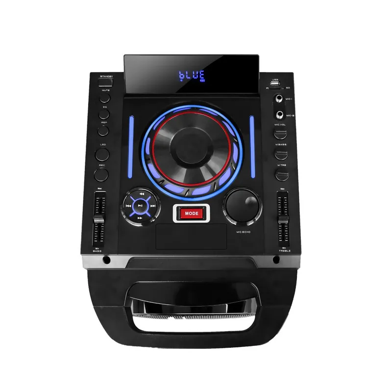 یکی از جذابترین ویژگیهای این اسپیکر، قابلیت کارائوکه است. با میکروفن بیسیمی که همراه محصول ارائه میشود، میتوانید استعداد خوانندگی خود را به نمایش بگذارید. پنل کنترل حرفهای این دستگاه با ولومهای کشویی برای تنظیمات Bass، Treble و Echo، حس کار با یک دستگاه DJ واقعی را به شما میدهد و به شما اجازه میدهد صدای خروجی را مطابق سلیقه خود شخصیسازی کنید.