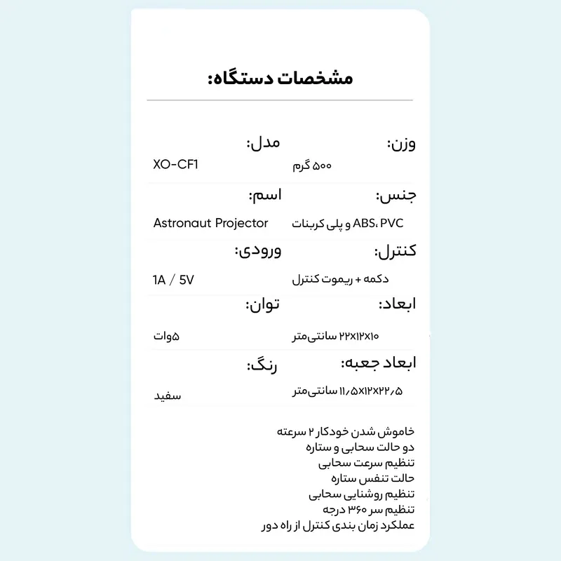 آیا از دیوارهای ساده و سقف بیروح اتاق خود خسته شدهاید؟ با پروژکتور کهکشانی و چراغ خواب طرح فضانورد XO مدل CF1، میتوانید هر شب یک کهکشان شگفتانگیز و رویایی را بالای سر خود داشته باشید. این گجت بینظیر نه تنها یک چراغ خواب، بلکه یک دستگاه دکوراتیو مدرن و یک ابزار آرامشبخش برای تمام سنین است.
